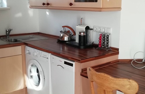 EBK fully equipped with fridge incl. Freezer, dishwasher, washing machine, ceramic hob 2 flames, small oven, microwave, Nespresso coffee machine, kettle, crockery, small dining area with 2 chairs.