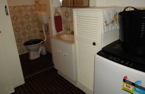 Combined bathroom with vanity, shower, w/c and laundry with sink and top loading washing machine.