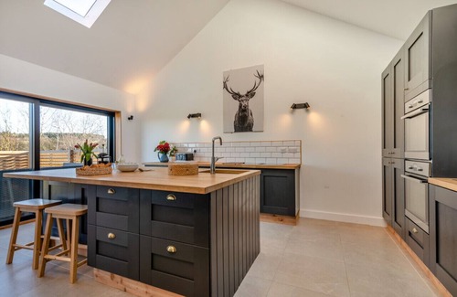 Outside, the garden has a decked area with outdoor furniture, as well as a private hot tub to unwind in after a long walk. There’s also a lawn area where children and dogs can play. Private parking is available at the property.