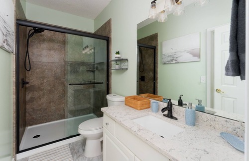 This home features two full bathrooms, fully stocked with essential toiletries and fresh towels to ensure optimal comfort.