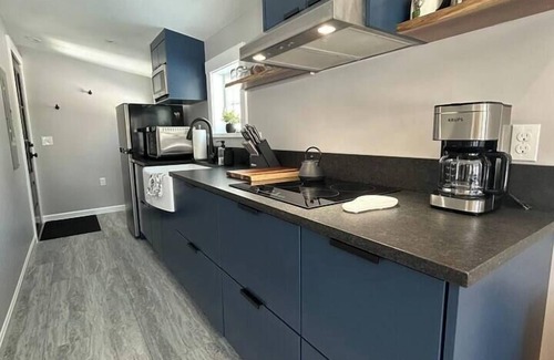 This memorable location is anything but ordinary. This new, modern space, perched in the trees, overlooks a small-scale farm where the animals are just as well cared for as our guests. Do not underestimate the 600 square foot space. When you step inside, you'll be astounded by the spaciousness, clever use of space, and amenities available to our guests. From an open, sunny living room to an expanded balcony overlooking the duck pond, you'll have plenty of room to unwind and relax.