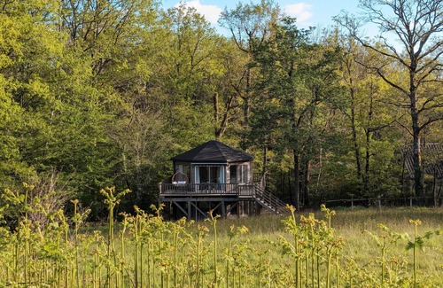 Perched three meters high, the cabin offers an exceptional view of the forest and the Château de Biron.
