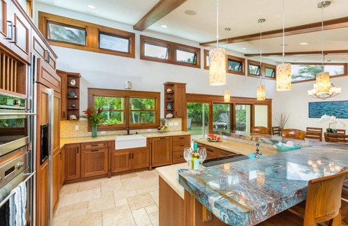 E komo mai (welcome) to Hale Niuiki! The home's expansive open floor plan seamlessly connects the living and dining spaces to the newly-remodeled kitchen, allowing large groups endless options for spending time together. Stone floors, elegant wood-beam ceilings, and modern furnishings provide a backdrop of comfortable luxury for your Hawaiian retreat.