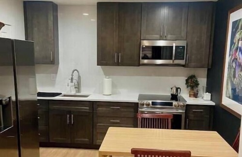 Quartz counter and backslash Refrigerator with ice and water dispenser, plenty of cabinets. Dining table with two chairs plus stool if 3rd seat needed.