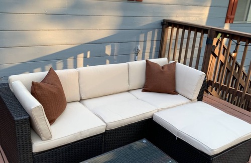 Our back deck is a great place to hang out at and look at the stars on our cozy outdoor sectional, or enjoy the propane fire pit at the outdoor dining table. Have a summer evening BBQ with the family using the charcoal grill. String lights are featured along the entire back deck to make the evenings even more magical :)