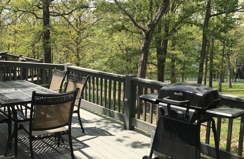 The kitchen boasts granite countertops and an open view to the back deck. In the mornings, sip your coffee while watching deer graze nearby. The deck is equipped with a gas grill, table, and chairs—perfect for laid-back evening meals outdoors.