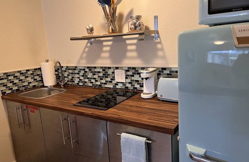 Guest House #2 is also a 400 square foot one-bedroom with a full bathroom, walk-in closet and kitchenette which boasts a wooden countertop, 1950’s baby blue GE Refrigerator, 2-burner induction cooktop, microwave, toaster and single cup Keurig coffee maker. This unit has a classic retro vibe. The kitchenette is fully stocked with cooking and dining ware, utensils, coffee, sugars and creamer for your morning cup of Joe. The bedroom includes a queen size bed and small desk workspace. This space accommodates 2 people comfortably. A small dresser can be used for those longer stays and a walk in closet with plenty of room for your dress clothes and coats.