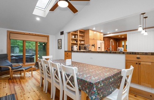 Inside, you’ll find warm Pine and Maple hardwood floors, a vaulted living space filled with natural light from multiple skylights, and a cozy wood-burning fireplace. The fully equipped kitchen is set up for serious cooking, complete with a pantry and all major appliances.