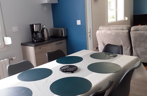 Votre location de vacances comprend au RDC : une cuisine équipée et ouverte sur un salon, une chambre (2 lits de 80x200 jumelable en un lit de 160), une salle d'eau, un wc indépendant et une seconde chambre (un lit de 140), ayant vue sur mer. À l'étage, une chambre spacieuse (lit de 160) et une salle d'eau avec wc. À l'extérieur, jardin arboré, entourant la maison avec pelouse, place de parking devant le garage (possibilité également dans la rue devant la maison ou à 50 mètres plus bas sur parking public ), petite véranda à l'entrée de la maison et coin buanderie.