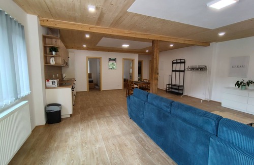 Large, child friendly, modern apartment house "U Dzina", 2 storeys, renovated in 2023. In a sunny position, 2.5 km from the skiing area. For shared use: garden with lawn for sunbathing, swimming pool (7 x 3 m, seasonal availability: 01.Jun. and 30.Sep.) with shutter cover. Boccia, pergola, garden furniture, barbecue, children's playground. In the complex: billiard table, playroom, table football, boutique, kiosk, storage room for bicycles, sun terrace, roof terrace, storage room for skis. Parking (for 7 cars). Supermarket 1.7 km, restaurant 1.5 km, bar, café 10 m, bus stop "Desná Sklář" 550 m, railway station "Dolní Polubný" 550 m. Golf course (9 hole) 15 km, minigolf 6 km, ski lift 2.5 km, ski rental 2.5 km, ski school 2.5 km, cross country ski track 6 km. Nearby attractions: vodopády na Černé Desné 6 km, Štěpánka 6.5 km, Světlá 5 km, vodopády Mumlava 15 km, Giganteria Piechowice(Pl) 33 km, Běžecký lyžařský areál Jakuszyce(Pl) 15 km. Well-known ski regions can easily be reached: Černá Říčka 2.5 km, U Čápa 6 km, Tanvaldský Špičák 7 km. Hiking paths: Jizerka 10 km, protržená přehrada 13 km. Please note: suitable for families.