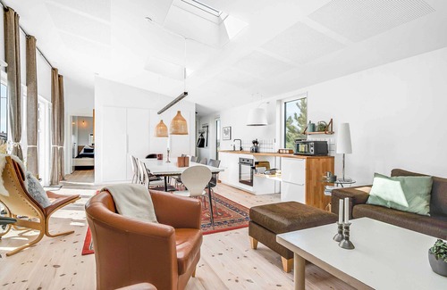 The main house contains a large and beautiful kitchen-living area with a kitchen, living room and dining area, where there is room for the whole family or friends. A large sofa group, flat-screen TV and wood-burning stove await you here, where the coziness can take place in the evening hours. In addition, there is a nice dining table ready for the holiday meals as well as a bright and functional kitchen. In this room there are skylights, which provide fantastic natural light with the good ceiling height.