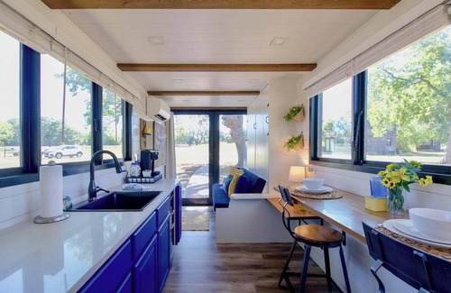 Experience the charm of container home living in this unique tiny home located in Waco. Perfect for a romantic getaway, this property comfortably sleeps two guests in a custom Murphy bed featuring a super-comfy Tuft & Needle queen size mattress. The design blends modern amenities with a cozy atmosphere, making it an ideal retreat for those looking to unwind.