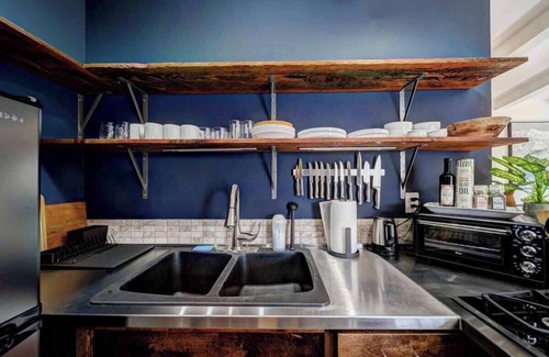 Snug yet mighty, the kitchen carries out the navy and yellow color palette from the living area. And yes! It’s stocked with everything you’ll need to cook meals together (note: we have a toaster oven instead of a full oven). You can also sip coffee and tea at the counter bar – or enjoy a nourishing meal at our table for two. These are also great spots to play card games from our collection.