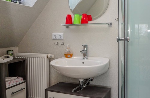 The stairs as usual on the island in old houses (relatively narrow steps, therefore not necessarily suitable for large dogs) leads you to a very beautiful, with attention to detail, furnished apartment. The apartment has two double and one single room, in one of the double rooms additionally a comfortable sofa bed and a separate bathroom is available. In the other double room and in the single room you can expect except bed / beds and closet also seating. A large lounge with music system and flat screen invites you to cozy evenings. In the adjoining fitted kitchen you will find all the important utensils and appliances to take care of your physical well-being. From the lounge, a door leads to a bathroom with sink, toilet and modern shower as well as to a separate toilet. From all the windows of the apartment you can let your eyes wander over the vast meadows and fields. In the garden (exclusively for house guests) you can expect a spacious playground, a beautiful terrace with outdoor seating and barbecue, for a relaxing stay. Also sun loungers and a beach chair invite you to linger. The four members of the Heidschnucken family "Miss Piggy", "Little Joe", Lilli Fee "and" Pinocchio "are looking forward to a visit of the little and big guests in the Villa FarbenFroh. Parking is available directly at the house.
