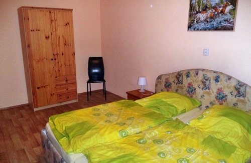 On the ground floor is the apartment. Kitchen with dining area, 2 bedrooms, living room, guest toilet for a total of 4 persons. In the 1. Floor are 4 bedrooms - 1 single, 2 double and 1 four-bed room (for a total of 9 people), 2 bathrooms with 3 shower facilities with bath and toilet. Facilities: Parking and small children's playground next to the house, fridge (freezer), dishwasher, coffee machine (s), kettle, toaster, satellite, W-LAN, radio / CD player, large swivel grill incl. Firewood (on request), towels and sheets.
