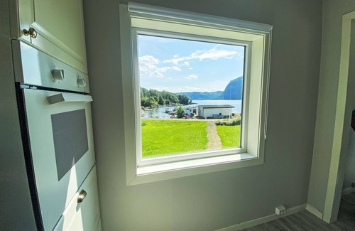 "Sjøtun", 5-room house 116 m2 on 2 levels. Bright, comfortable and beautiful furnishings: living/dining room with Scandinavian wood stove, dining table and TV. Exit to the terrace. Open kitchen (oven, dishwasher, 4 ceramic glass hob hotplates, microwave, freezer, electric coffee machine). Exit to the terrace. Shower/WC. Forced-air heating, underfloor heating. Upper floor: (steep stair), 1 open room with 1 double bed (180 cm, length 200 cm). 2 rooms, each room with 1 bed (90 cm, length 200 cm). 1 room with 2 beds (90 cm, length 200 cm). Sleeping alcove with 1 sleeping facility. Sep. WC. Large terrace 100 m2. Terrace furniture, barbecue. Beautiful panoramic view of the sea, the mountains and fjord. Facilities: washing machine, baby cot. Internet (WiFi, free). Please note: non-smoking house. TV via WIFI. Freeze approx. 300 l. Instead of an enclosed bedroom, some sleeping areas are located in an open-plan area (gallery, alcove, etc.). 924531169