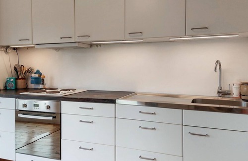 A vacation where you can get back to nature. This is what this child-friendly vacation home offers. Situated in a unique landscape near a lake and with plenty of space, this accommodation promises great vacations full of variety for the big family. Do you like fishing? Just a few minutes walk from the house, you can try to hook something nice for dinner and teach the adventure-hungry kids how to fish. Don't forget to take a plunge into the beautiful water and pick some sweet berries. When you come home from a trip, the kids can swing, jump on the trampoline and play in the tree house with a slide. While cooking, the little ones in the family can romp in the lovely play area in the living room. In the evening, enjoy the warm wood-fired hot tub overlooking the forest.