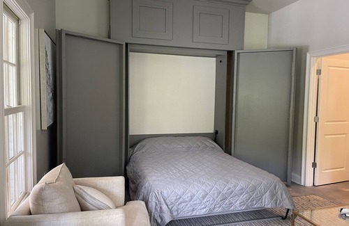 Queen murphy bed, bathroom, living area, outdoor patio with furniture and tv, pool located less than 1 mile from campus. Private stairs to the top of a hill to a beautiful pool and pool house. Lamar park is next door with sidewalks and lake.