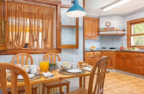 The dining room features a large wooden tableand majestic chairs, while the fully equipped Mallorcan kitchenincludes a gas stove, coffee maker, microwave, and all the utensils needed for home cooking.