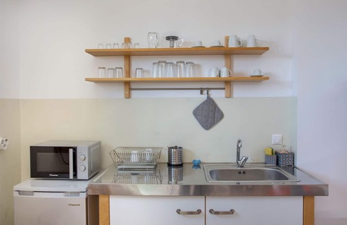 Taking the stairs up to the 1st floor you will find a second living room with a fireplace, a small kitchen, and a spacious balcony where you can admire the breathtaking view. There are as well 2 bedrooms, the first one has a queen bed and the other one has two twin beds that can be easily transformed into a double bed upon request. Each room has a private balcony where you can admire the astounding sunsets. Ending, one full bathroom with a shower. Each floor has its private access to the garden.