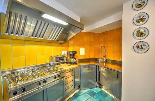 You will be able to enter the kitchen from the living room. It is professional-grade, equipped with a six-burner gas cooker, an electric oven, a large refrigerator with freezer, a dishwasher, a microwave oven, an Italian-style coffee-maker, an American-style coffee-maker (bring your filters!), a toaster and other small appliances.