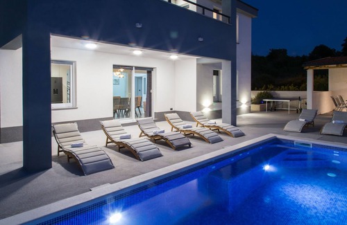 A beautiful 5-bedroom house located in Srinjine, just 15km from Split and 10km from Omis. The house features a spacious living room, a fully-equipped kitchen, three air-conditioner, four bathrooms, a private pool, a grill, and a lovely garden. The perfect blend of comfort and relaxation in a picturesque setting.