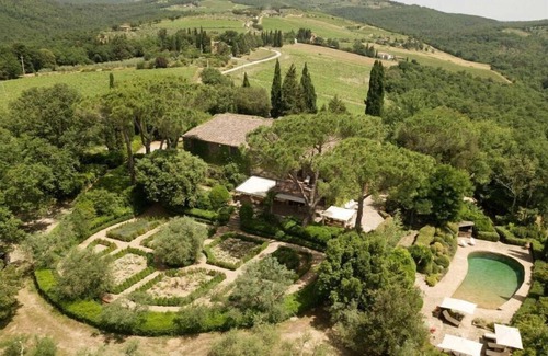 Wonderful villa with private pool and tennis court, nestled in the Chianti countryside, among olive groves and vineyards.