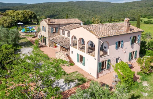 "Villa Marsiliana", 7-room villa 270 m2 on 2 levels. Spacious, tasteful and stylish furnishings: living room with panoramic window with TV. Exit to the garden. Large dining room with open-hearth fireplace (only for decoration). Exit to the garden. 1 large room with 1 double bed, shower/bidet/WC and air conditioning. Exit to the garden. Large, open kitchen (oven, dishwasher, 6 gas rings, toaster, kettle, microwave, electric coffee machine). Exit to the garden, to the terrace. Shower/bidet/WC. Upper floor: 1 room with 1 double bed (200 cm), shower/bidet/WC and air conditioning. 1 room with 1 double bed (180 cm), bath/shower/bidet/WC, double hand-basin and air conditioning. 1 room with 1 french bed (140 cm), bath/WC and air conditioning. 1 room with 1 double bed (200 cm), air conditioning. Shower/bidet/WC. Gas heating. Large balcony 15 m2, terrace roofed, patio, porch. Terrace furniture, balcony furniture, barbecue, deck chairs. Marvellous panoramic view of the countryside. Facilities: washing machine, mosquito net, baby cot for up to 2 year olds, hair dryer. Internet (WiFi, free). Parking (5 cars). Please note: non-smoking house. Maximum 1 pet/ dog allowed. Private entrance. The pool mentioned in the description is for private use. Mountain bike friendly: near the house a secure garage for up to 10 bikes (or sports equipment in general) equipped with an iron door and alarm. It includes 8 racks with the possibility of recharging and equipment for repairs. Bikes and accessories can be cleaned in a separate area. IT053015C23IPB8ZVK