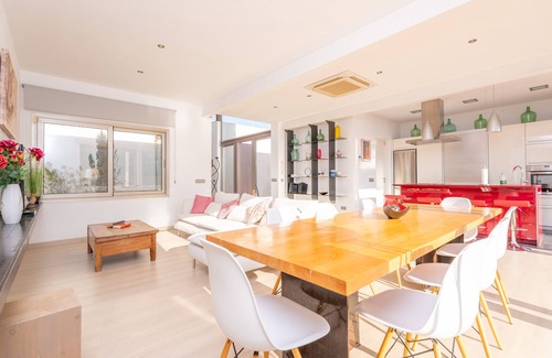 Moving into the modern interior of the house, you will find a large and bright space that combines the living room, dining room and kitchen. The living room, equipped with Smart TV and a sofa for the whole family, is perfect for relaxing after a day of sightseeing. The kitchen, integrated in the dining room, has an induction hob and everything you need to prepare delicious meals. The house has three bedrooms: one with a double bed and air conditioning, and two bedrooms with twin beds, both with air conditioning. The two bathrooms, one of them en suite, are fully equipped and have showers. If you are travelling with a baby, a cot and high chair will be provided. A laundry area with tumble dryer, iron and ironing board completes the amenities of the house.
