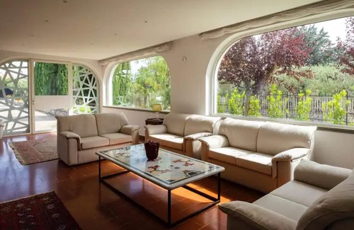 The villa boasts a private outdoor area with a heated pool, a whirlpool, a pine forest, a garden, an open terrace, a covered terrace, 2 balconies and an outdoor shower.
