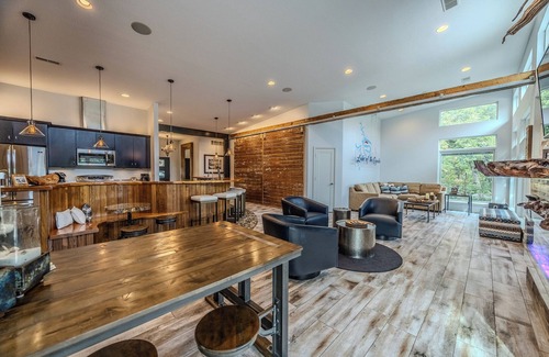 Voted the #1 vacation home in Missouri by USA Today, this 8-bedroom, 9-bathroom retreat sits right on Lake of the Ozarks’ 7MM. Enjoy direct lake access with two private boat slips, a swim dock, and two expansive patios with fireplaces perfect for cool evenings. The home is ideal for large groups, offering a wet bar with multiple TVs for game day, two kitchens, and a rustic coffee bar.