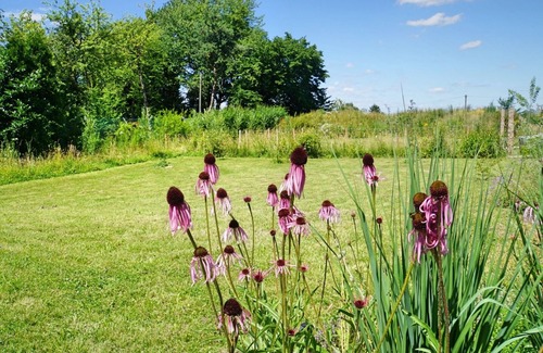 Outside, a fully enclosed garden of approximately 2500 m² awaits, featuring multiple seating areas, comfortable sun loungers, a barbecue, and a sun umbrella for warm days. Take in the tranquility, greenery, and fresh air surrounding you. For electric vehicles, a charging station is available (advance booking required).