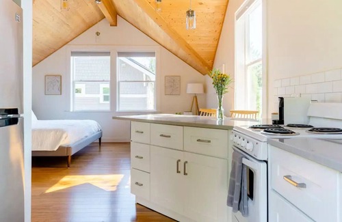Perch on a stool at the breakfast bar under airy vaulted pine ceilings in this bright, cozy studio home. This modern backyard cottage is tucked away in a private setting, yet steps away from everything this hip neighborhood has to offer. Custom designed and hand-built by the hosts, this backyard cottage is a sanctuary in the city. After a day of exploring nearby beaches, beautiful parks, kayaking the sound or eating your way through the Farmer’s Market, come home and unwind on the private deck. Free street parking!