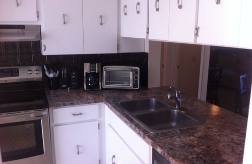 Kitchen: golf course view and water view. Light and sunny. Refrigerator with ice maker, range with self-cleaning convection oven, dishwasher, microwave, toaster oven, coffee maker, blender, mixer, pots, pans, bake ware, glasses, cups, plates silverware, etc.