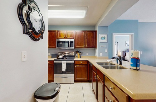 Inside, the living room features a flatscreen TV, a spacious sofa, and access to a private, furnished balcony overlooking the water. Take the provided beach towels out for a long day on the white sands, then come home to enjoy your favorite Blu-ray movies with lots of buttered popcorn and good company. The full kitchen is equipped with stainless steel appliances that include a French-door refrigerator and dishwasher. You'll also have all the gadgets and counter space the family chef will need to prepare delicious meals for the gang. You can serve up to six guests at the dining table and the kids will love taking their afternoon snacks at the breakfast bar. Take advantage of the home's work desk and chair to knock out those last-minute projects while the private washer/dryer gets everyone's laundry nice and clean. Spread out some board games for a fun family game night then prepare for a delightful sleep in one of the home's well-appointed bedrooms, two with en suite baths and one with balcony access. You'll love waking up with a trip to the shared pool and hot tub via the elevator, while the central air conditioning and ceiling fans will keep the home nice and cool on those hot summer days.