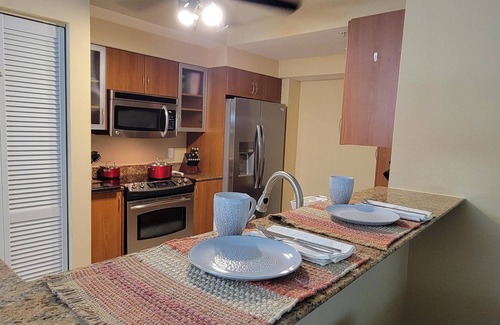 This beautiful two-bedroom unit includes all utilities and all furniture that you see in photos. (Sleeps up to 5). The beautiful and inviting kitchen is fully-stocked with all cook-wear, appliances and cutlery etc and features granite counters, European cabinetry, and a breakfast bar. The living room/dining room space is bright and airy featuring comfortable furnishings, a sofa, and a large screen smart TV (Roku). The balcony is a great place to take your morning coffee or to relax under the stars using the new rattan table and chairs with an inviting view of the inner courtyard, including the pool.