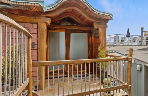 Sitting on the sand of Miramar Beach, this quirky two level home is ideal for the vacationer who wants to relax and have fun on the beach. As you enter the main level of the Whimsical Wave, the large picturesque window with ocean views will immediately grab your attention. Not your average vacation rental, this home boasts interesting architectural features such as the high beam ceilings, warm wood paneling, a spiral staircase, and many interesting nooks and curves.