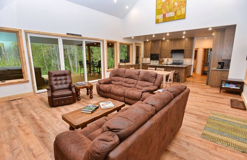 White Bark Lodge is a single level home that sleeps up to 11 guests with 4 bedrooms, 3 bathrooms, and an open floor plan for family gatherings. The Master suite has a flat screen TV with DVD player, King bed, and attached bath. Guest bedroom one also has a King bed and TV with hallway access to the guest bathroom. Guest bedroom two offers a Full bed, and guest bedroom three is the Bunk room with a Twin over Twin bunk set, and Full size bed with a Twin trundle underneath. Living room has a large flat screen TV with Blu-ray player and Amazon Firestick for guests to log in and stream. The kitchen offers a 5-burner gas range and plenty or prep space for the group chef. Dine at the table or sit at the bar for a quick bite or snack.