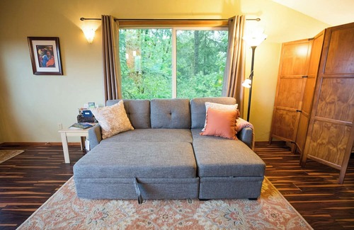 This lovely tree top space is attached to our home and includes separate entry, complete privacy in the unit, has its own upstairs deck, and includes the use of our shared lower deck and hot tub. The kitchen is a "kitchenette" with no stove, but we do provide a single burner hot plate.