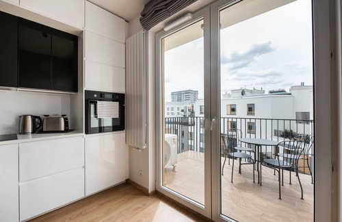 Wola Skwer Sunny Apartment is an extremely functional flat that can accommodate 6 guests. It has a beautifully furnished living room with a kitchenette, 2 bedrooms, a balcony and a bathroom. The flat is freshly renovated. Guests have a range of practical amenities at their disposal, including a TV, air conditioning, dishwasher, fridge, toaster, oven and kitchen accessories. The flat comes with a parking space in the underground garage.