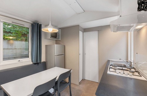 You will be staying in a 3-room mobile home with a total area of 24 square meters. The living room features a dining table, and there are two separate bedrooms - one with a double bed and another with two beds and one bunk bed. The kitchen is equipped with four gas rings, a microwave, a freezer, and an electric coffee machine.