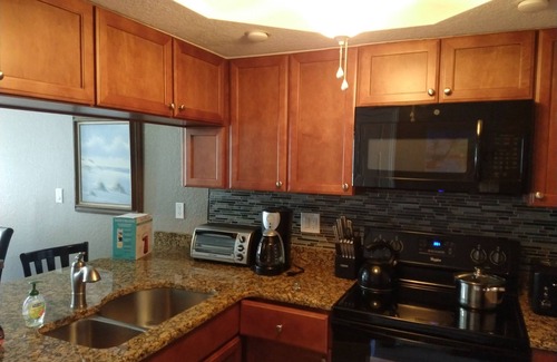 The kitchen comes fully appointed. All appliances, dishes, pots and pans, and glassware. There is a Range/oven, toaster, blender and coffee maker, dishwasher, microwave and tea kettle. As well as eating utensils and plenty of storage.