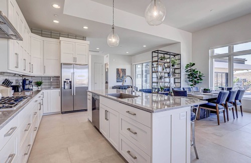 Venture downstairs to find a charming TV room with lounging sofas and 75” TV, where full sliding doors reveal access to the covered patio and the surrounding red rock landscape. Need additional sleeping space? There is a double Murphy bed hidden in a hutch, along with a queen pull out couch, making it easy to accommodate extra guests. Little ones will delight in the hidden play area under the stairs, stocked with toys, a pack-n-play, and games. The closet is filled with extra bed supplies and plush pool towels for your convenience.